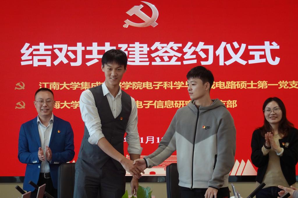 上午,太阳成集团tyc33455cc电子科学与集成电路硕士第一党支部书记胡浩宇与上海大学微电子学院电子信息研究生党支部书记俞浩在霞客湾校区行政楼304会议室共同签署结对共建协议,糜海燕、袁铭见证签约。此次结对共建是实现资源共享、互学互鉴、共同提高的重要举措,标志着两院在携手并进、共创未来的道路上迈出了坚实的一步。