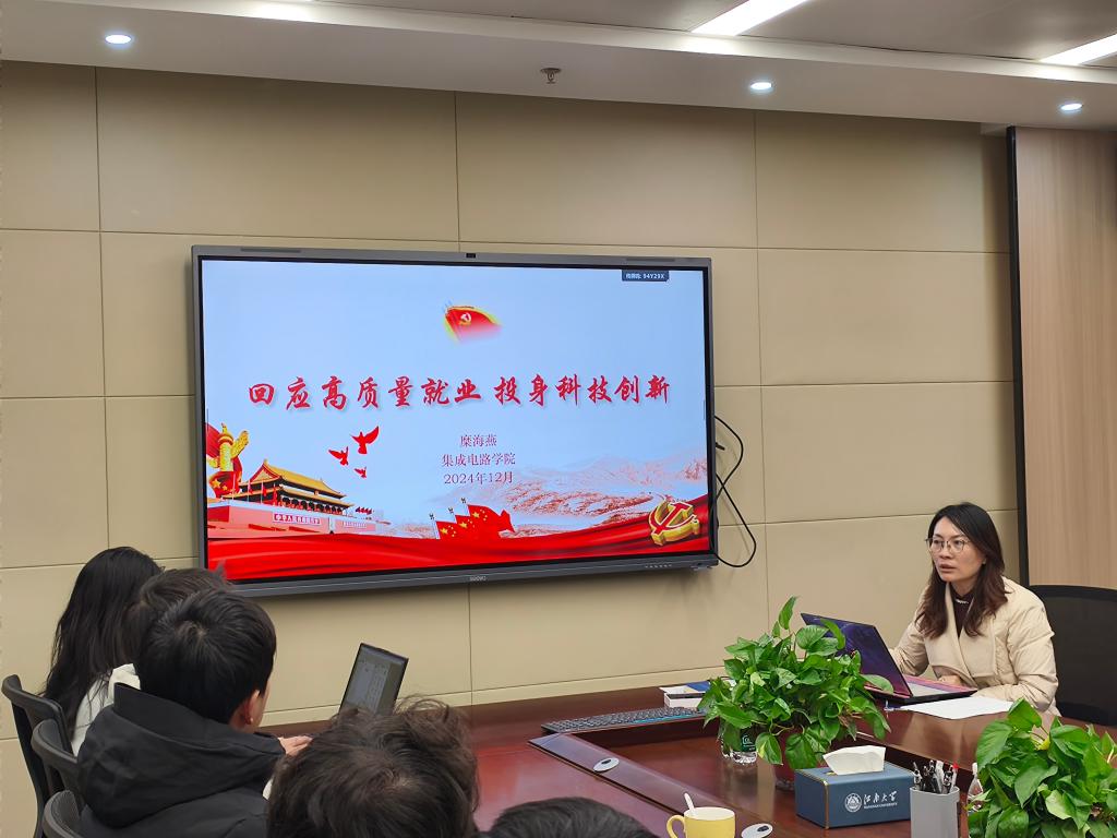 太阳成集团tyc33455cc糜海燕副书记以《回应高质量就业,投身科技创新》为题讲授党课。目前2025年中国国际大学生创新大赛校内选拔赛已经预启动,她结合习近平总书记给中国国际大学生创新大赛参赛学生代表的重要回信以及二十届中央政治局第十四次集体学习促进高质量充分就业内容,鼓励青年党员弘扬科学精神,积极投身科技创新,把个人理想与祖国的未来、把自己的人生同民族的命运紧密联系起来,用自己的实际行动为以科技现代化支撑中国式现代化贡献青春力量。
