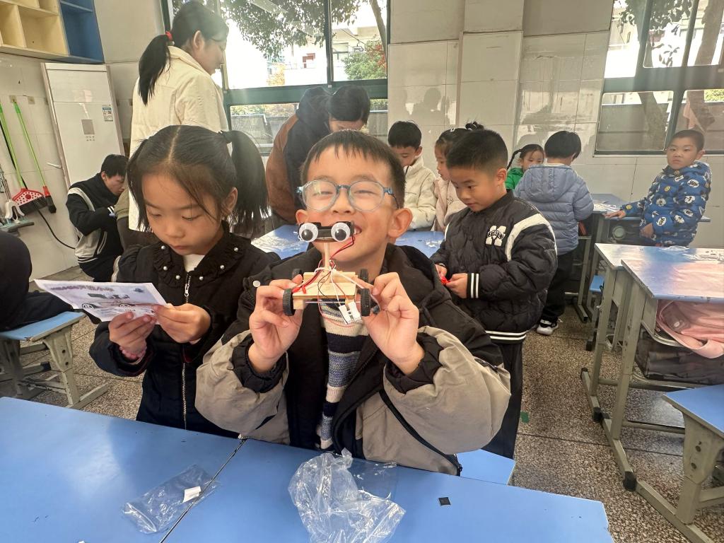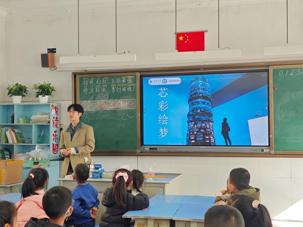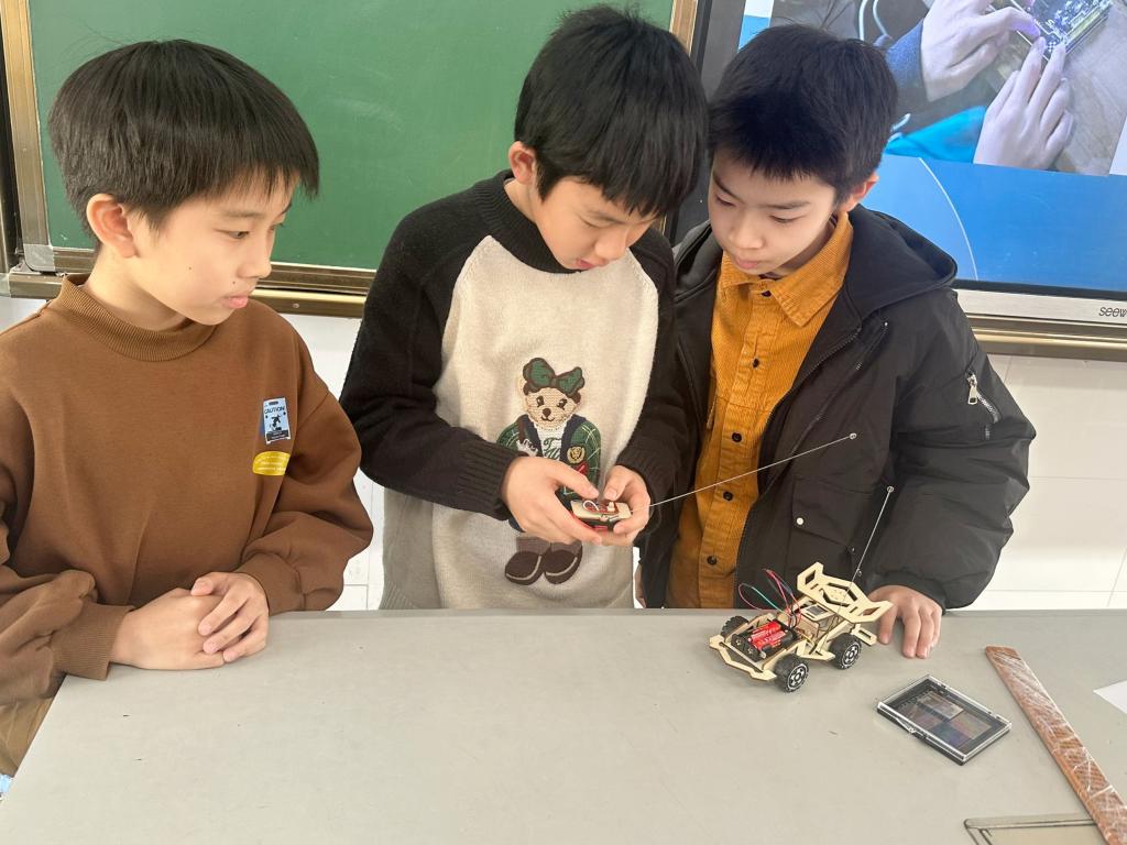 在一年级课堂上,李文龙从芯片的外形与颜色切入,引导孩子们亲手触摸芯片样品,结合视频将集成电路比作城市交通网络、晶体管比作高楼大厦、电流比作车流,生动揭示芯片工作原理;随后通过生活场景图片与设备拆解图,帮助孩子们发现芯片在智能汽车、电话手表等日常用品中的应用。课程尾声,志愿者们指导孩子们拼装声控小车,在动手尝试中加深对芯片功能的理解。