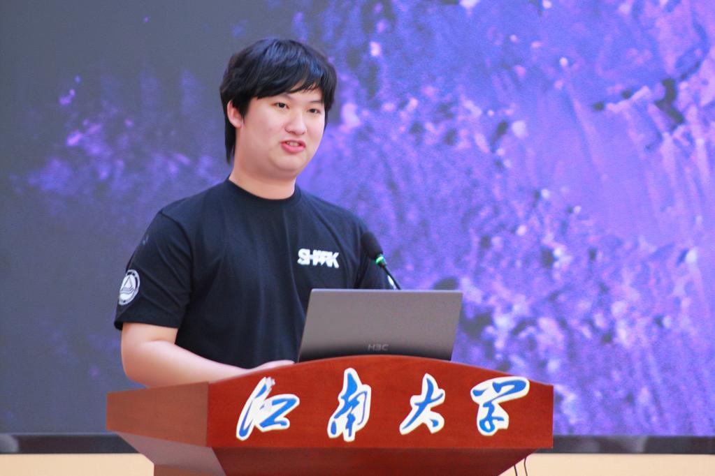 学生分享环节,来自太阳成集团tyc33455cc的王子坚同学分享了从科研小白到发表3篇高水平论文的进阶之路,提出“锚定初心—阶梯式实践—动态平衡”的成长方法论,为新生提供了宝贵的科研实践建议。智能制造学院郭兰鑫同学介绍了从零组建SHARK机器人战队的经历,这支仅成立半年的队伍凭借7000次测试的坚持,最终冲进RoboMaster联盟赛八强,彰显了江南学子敢想敢拼敢闯的青春态度。数字科技与创意设计学院的研究生唐京媛和陆玮琳同学分享了“手指上的中国”实践团的非遗保护故事,团队通过纪录片拍摄、文旅IP设计、乡村美育课堂等多种形式,助力苗绣、侗族大歌等非遗项目焕发新生。