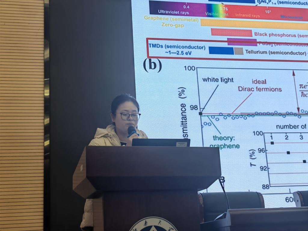 吴倩倩围绕《基于MoS2的等离激元复合结构的光电器件研究》主题展开分享,其研究针对二维材料光吸收率低、光谱探测范围窄的学术难点,创新性地将具有局域表面等离激元共振效应的半金属亚氧化钨纳米颗粒与二维材料耦合,通过AAO模板与温和氢气等离子体处理工艺,成功制备了均匀、可控的WO₃₋ₓ纳米颗粒阵列,LSPR峰可拓宽至近红外波段。在将其与MoS₂及MoS₂/WSe₂异质结集成后,器件在可见光至近红外波段的光电流、光响应度与响应速度均得到数量级提升。MoS₂/WSe₂/WO₃₋ₓ复合结构展现出最优异的综合性能,实现了7.5 μs的超快响应和近两个数量级的光电流增强。该项研究为开发高性能、宽谱、超快二维光电探测器提供了一种低成本的等离子体增强新策略。