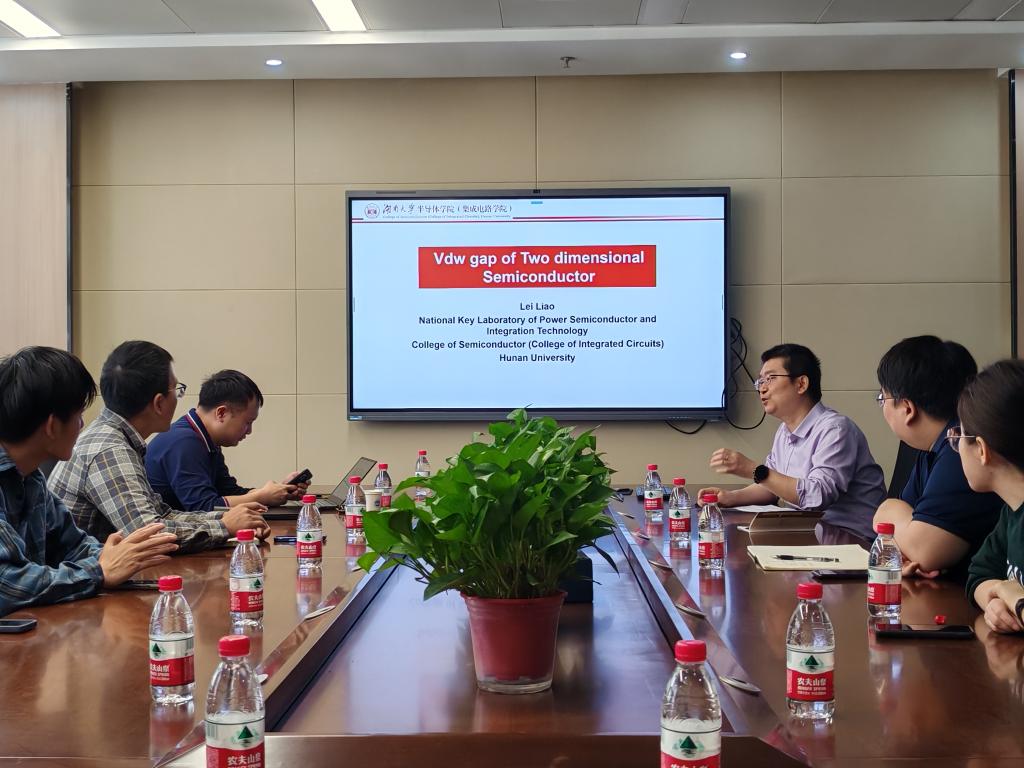 廖蕾教授在讲座中分享了团队在二维半导体范德瓦尔斯间隙领域的两项最新研究成果:一是通过水分子预吸附策略调节水蒸气饱和压力,实现二硫化钼等二维材料间范德瓦尔斯间隙高度在5.5埃至53.6埃范围内精准连续调控的可控范德瓦尔斯间隙技术,该技术为纳米尺度分子输运、离子筛分等基础研究提供新工具,并应用于构建展现出超高整流比(>10⁵)和理想因子(接近1)的MoS₂同质结二极管及压力传感器等器件设计,相关成果发表于《自然・纳米技术》;二是在存储器研究中利用范德瓦尔斯间隙优化二硫化钼浮栅存储器界面特性,通过臭氧处理硫化铪(HfS₂)形成原子级平整间隙结构以抑制电荷泄漏,使制备的存储器实现超低漏电流(0.1 fA・μm⁻¹)、长数据保持时间(>10⁵秒)、优异循环耐久性(>1000次)及多比特存储和“存算一体”逻辑运算等性能提升,该成果发表于《先进功能材料》,为高密度、低功耗存储器开发提供新思路。
